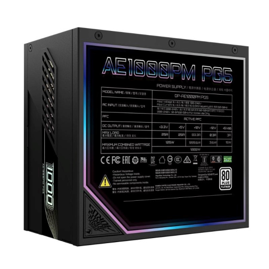 AE1000PM PG5 dokáže vydržet až 3násobek výkonu GPU a 2násobek celkového výkonu. Je plně kompatibilní se standardem Intel ATX 3.1, podporuje až 200% výkyvy výkonu a dosahuje 70% účinnosti při nízké zátěži. Přiložený vysoce kvalitní nativní 16kolíkový kabel navíc zajišťuje kompatibilitu s grafickými kartami PCIe Gen 5 a poskytuje výkon až 600 wattů.