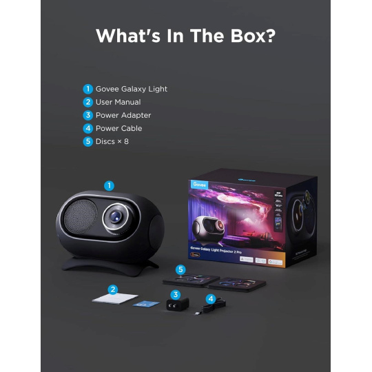 Součástí balení je osm unikátních disků s různými galaktickými motivy, které lze jednoduše a rychle měnit. Každý disk přináší odlišnou atmosféru, od mlhovin až po realistickou noční oblohu. Díky snadnému mechanismu výměny můžete okamžitě proměnit svůj prostor.