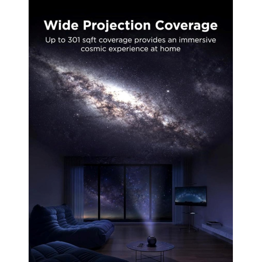 S úhlem projekce 90° a plochou až 28 m2 vytvoří projektor opravdu pohlcující prostředí. Hvězdná obloha zaplní celou místnost a vy si tak užijete pocit, že se nacházíte přímo pod otevřeným nebem. Tato vlastnost dělá projektor ideální pro ložnice, obývací pokoje i dětské koutky.