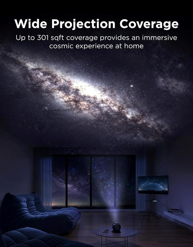 S úhlem projekce 90° a plochou až 28 m2 vytvoří projektor opravdu pohlcující prostředí. Hvězdná obloha zaplní celou místnost a vy si tak užijete pocit, že se nacházíte přímo pod otevřeným nebem. Tato vlastnost dělá projektor ideální pro ložnice, obývací pokoje i dětské koutky.