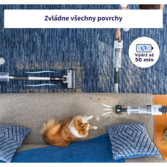 Tyčový vysavač Levoit je navržený, aby maximálně usnadnil úklid vašeho domova, ať už ho sdílíte se čtyřnohým, nebo dvounohým miláčkem. Vysavač je vybaven rotačním kartáčem s kombinací gumových a textilních lamel, který byl navržen tak, aby na něm nedocházelo ke hromadění namotaných vlasů nebo chlupů. Zároveň je ale kartáč efektivní a zachytává maximální množství nečistot. Vysavač pracuje s 22,2V vyjímatelným akumulátorem s kapacitou 2200 mAh a indikací nabití. Motor je s výkonem 180 W nezvykle tichý, při běžném provozu vydává 74 dB, v Turbo režimu pak 81 dB. Vysavač s plně nabitou baterií dokáže pracovat až 50 minut, což umožní úklid celého obydlí na jedno nabití. Úklid s LVAC 200 je radost díky jeho velmi nízké hmotnosti 1,45 kg. Díky tomu je snadné s vysavačem odstranit i pavučiny ze stropu, prach ze žaluzií nebo nečistoty pod nábytkem. V balení naleznete dlouhou a krátkou násadu, rotační kartáč, 2v1 kartáč na čalounění nebo zvířecí srst a 2v1 štěrbinový nástavec s kartáčem. Tím máte perfektní sadu nástrojů pro kompletní úklid. Levoit LVAC si hravě poradí se všemi povrchy, ať už jsou to koberce, tvrdé podlahy nebo čalounění. Kartáčový nástavec je navíc vybavený LED světlem, takže umožní práci v tmavých zákoutích, a navíc osvětluje přítomné nečistoty. Vysavač v sobě skrývá 5násobný filtrační systém, který odstraňuje částice od velikosti 0,3 mikrometrů. Nečistoty se shromažďují v 0,75L nádobě s mechanizmem pro snadné a hygienické vyprazdňování. Filtry i kartáč jsou jednoduše vyjímatelné a omyvatelné.