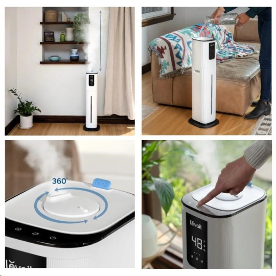 Zvlhčovač Levoit OasisMist Smart je vysoký 72 cm a pára je distribuovaná 360° rotující parní tryskou až do výšky 150 cm. Právě věžovitý design a distribuce páry do výšky zaručí dokonalé zvlhčení vzduchu v místnosti. U menších zvlhčovačů pára padá na podlahu příliš rychle, kde se vysráží na vodu a je nutné je vždy postavit na vyvýšené plochy, což často nevypadá dobře. Design LEVOIT OASIMIST oceníte i jako volně stojící doplněk interiéru.