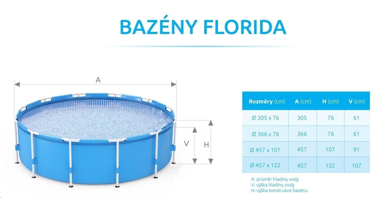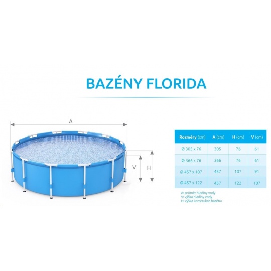Bazén Marimex Florida se řadí mezi velmi oblíbené nadzemní bazény v České republice. Koupání ve vlastním velkém bazénu si může dopřát opravdu každý. Hlavním benefitem bazénu Florida je výhodná cena, snadná údržba, stabilita konstrukce, široká hladina vody i snadné zprovoznění. Stačí jen připravit místo na bazén, rozvinout bazénovou podložku, bazén rozbalit, sestavit podpěrnou konstrukci, na kterou se navlékne bazénová folie. Od vybalení bazénu můžete do 30 minut napouštět vodu.