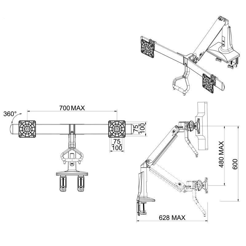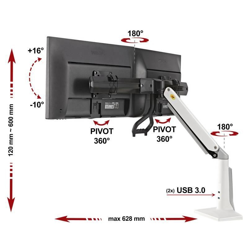 Stolní držák na 2 monitory NB F27W Profesionální stolní držák na 2 monitory 19-27", otočný +/-180°, sklopný +16°/-10°, nastavení výšky 120-600mm, vzdálenost od úchytu dle natočení 0-628mm, 2x port USB 3.0, 2 typy stolních úchytů, systém vedení kabeláže, VESA 75x75 a 100x100, nosnost 12kg, bílé provedení Držák v bílém provedení pro zavěšení dvou monitorů vedle sebe, profesionální kvality a moderního designu. Ideální pomocník, pokud potřebujete dát 2 monitory na stolní držák vedle sebe, ať už do roviny nebo do paraboly. Držák je plně nastavitelný - otočný, sklopný, výškově polohovatelný, funkce PIVOT pro natočení monitorů do horizontální nebo vertikální polohy. Pod monitory je madlo pro velmi snadné polohování jednou rukou - kdykoliv ihned změníte polohu monitorů snadno, rychle a bez použití jakéhokoliv nářadí. Držák je možné uchytit na stolové desky nebo jakékoliv vodorovné plochy o síle 10mm až 95mm, uchycení je možné buď na okraj (2 svorky) nebo kamkoliv do prostoru (nutný otvor 10-50mm). Rameno držáku má systém pro skryté vedení kabeláže, na stolním úchytu jsou navíc 2 porty USB 3.0 Nastavitelný držák na dva monitory 19-27 palců, umístění vedle sebe do paraboly nebo roviny, plně polohovatelný snadno jednou rukou - NB F27W Technické údaje: zatížení 6kg až 12kg (hmotnost 1 monitoru 3-6kg) ideální pro zavěšení 2 monitorů s úhlopříčkou 19" až 27" držák podporuje VESA standardy pro uchycení monitorů 75x75 a 100x100 plně polohovatelný, snadná změna polohy jednou rukou pomocí madla otáčení do stran +/- 180° naklápění nahoru až 16°, dolů až 10° fukce PIVOT - možnost otočení každého monitoru z horizontální do vertikální polohy a zpět vzdálenost od úchytu max. 628mm výškové polohování 120mm až 600mm monitory jsou vedle sebe v mírné parabole úchyty monitorů jsou posuvné, monitory mohou být úplně u sebe (bez mezery) nebo s mezerou madlo pro snadnou změnu polohy držáku (je odnímatelné, pokud ho tam nechcete) maximální vzdálenost mezi středy monitorů 700mm vestavěné 2 porty USB 3.0 ve stolním úchytu systém pro skryté vedení kabeláže ramenem držáku výškové polohování zajišťuje plynová pružina s nastavitelnou tuhostí uchycení na stoly nebo vodorovné povrchy o síle 10mm až 95mm uchycení na okraj desky (2 svorky) nebo do prostoru (nutný otvor o průměru 10mm až 50mm) profesionální zpracování TOP kvalita barevné provedení bílé záruka 3 roky Bílý držák na dva monitory NB F27W Držák podporuje VESA standardy pro uchycení monitorů s VESA: VESA 75x75 VESA 100x100 Profesionální držák nejvyšší kvality s možností okamžité změny polohy monitorů bez použití nářadí, snadno, rychle pouze jednou rukou. Krásný design v bílém provedení, systém pro ukryté vedení kabeláže, integrované 2 porty USB 3.0.