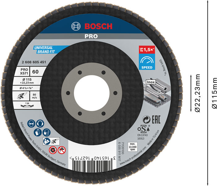Až 1,5× rychlejší než lamelový brusný kotouč Bosch X431 - Lamelové brusné kotouče nabízejí skvělé spojení odolnosti a rychlého úběru materiálu a kotouč PRO X571 má ještě rychlejší úběr než většina ostatních. Lamelový brusný kotouč PRO X571 má podklad z tkaniny X pro stabilní broušení. Pokročilé spojení zrn oxidu hlinitého a oxidu zirkoničitého nabízí rychlý úběr materiálu, takže lamelový kotouč je efektivnější, i když jej používáte na kalenou ocel. S otvorem 22,23 mm pro standardní úhlové brusky s pojistnou maticí.