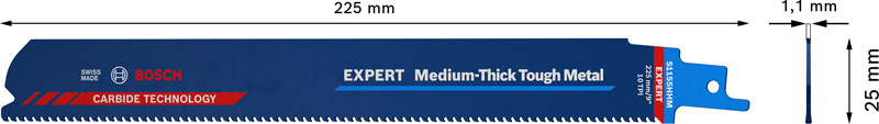 Vydrží až 50× déle při řezání odolných materiálů než pilový list Bosch S1122BF - Instalatéři, renovátoři a demoliční pracovníci vědí, že řezání ocelových trubek a profilů je náročný úkol dokonce i s výkonnou pilou ocaskou. Středně silný kov může při řezání velmi vibrovat. Pilový list EXPERT Medium-Thick Tough Metal tyto kovy řeže nejen efektivně a s minimálními vibracemi, ale nabízí také výjimečnou životnost. List s technologií Bosch Carbide Technology má velmi vysokou odolnost. Pilový list do pily ocasky Bosch EXPERT Medium-Thick Tough Metal je náš specialista na ocel střední tloušťky – jeho karbidové zuby mají jemnější rozteč než jeho protějšek pro silný kov. To znamená, že jednotlivé zuby se při řezání slabšího plechu ani středně silných trubek nezachytávají. Specializovaný technicky vyspělý list, usnadňuje práci, pro kterou je navržen. Pilové list do pily ocasky Bosch EXPERT Medium-Thick Tough Metal ocení každý řemeslník, který pravidelně pracuje se středně silnými ocelovými materiály. Kompatibilní se všemi pilami ocaskami s upínáním pro stopku S.