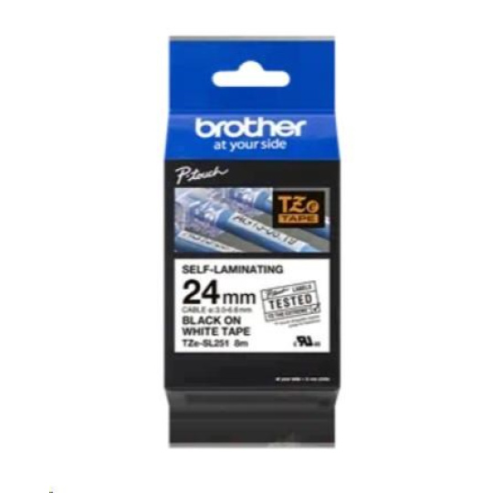 Samolaminovací páska TZe-SL251 s délkou 24 mm s černým tiskem na bílé byla vyvinutá pro dlouhodobou identifikaci síťových kabelů. Má speciální lepicí vlastnosti štítků pro trvanlivé pevné ovinutí kolem vašich vodičů a kabelů. Kompatibilní s některými modely P-touch, které používají pásky TZe 24 mm a 36 mm.