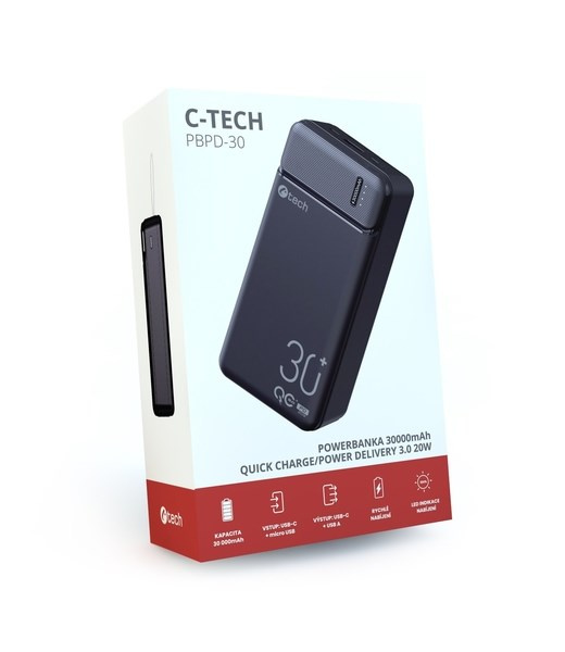 C-TECH Powerbanka 30000mAh, Li-Pol, 20W, USB-C/USB-A/micro USB