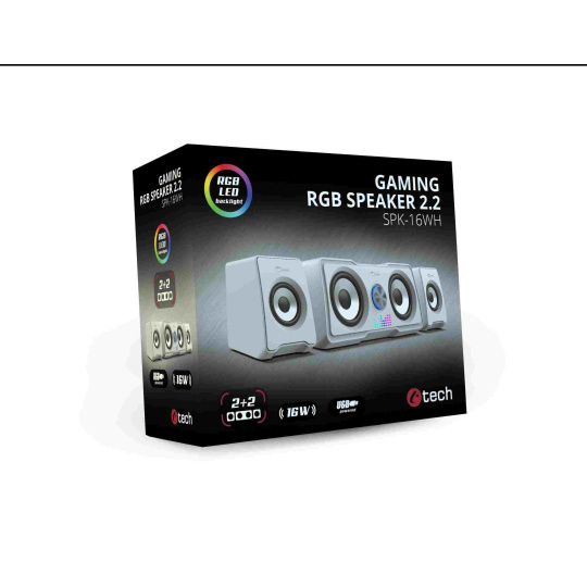Kompaktní PC reproduktory C-tech SPK-16WH 2.2 vám zprostředkují kvalitní zvuk s výkonem 16W a frekvenčním rozsahem 150-20kHz. Díky unikátní kombinaci měničů 2+2 je reprodukovaný zvuk bohatší a více dynamický, takže si jej využijete nejen při poslechu oblíbených skladem, ale i při hraní her. O jedinečnou atmosféru při poslechu hudby se postará automatické RGB podsvícení. K ovládání hlasitosti poslouží regulátor nacházející se na jednom z reproduktorů. Tento regulátor slouží k zapnutí a vypnutí zařízení. Připojení soustavy k zařízením zajistí kabel s 3,5mm jackem, napájení zase USB kabel.