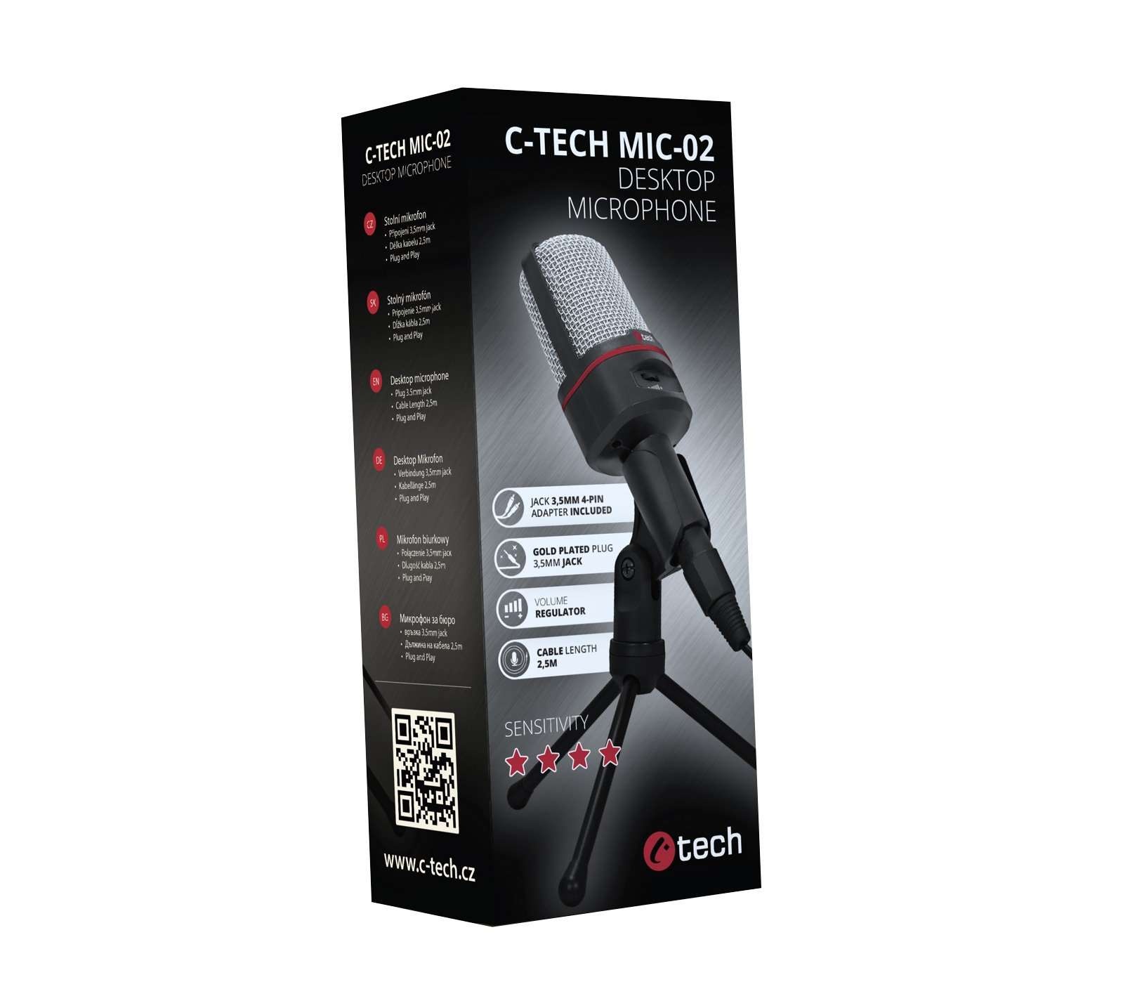 C-TECH MIC-02 je vysoce kvalitní mikrofon s přirozenou kvalitou reprodukce hlasu pro každodenní použití. Své uplatnění najde jak při použití s komunikačními programy, tak i při vytváření youtube videí nebo live přenosů. Mikrofon se připojuje pomocí 2,5m kabelu s pozlaceným stereo konektorem jack 3,5mm, v balení však naleznete i redukci jack stereo 3-pin/4-pin pro připojení mikrofonu k zařízení, které je vybaveno sloučeným audio konektorem pro mikrofon a sluchátka. Mikrofon je vybaven zapínacím tlačítkem s regulací hlasitosti. V balení naleznete praktický podstavec (tripod), díky kterému lze umístit mikrofon do různých poloh.