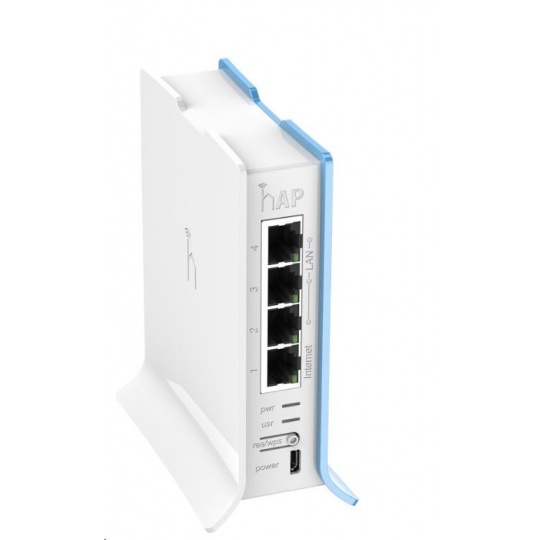hAP lite je nový router (AP) určený zejména do domácností a malých kanceláří. Nábízí 2.4GHz WiFi se standardy 802.11 b/g/n s tlačítkem WPS pro snadné připojení klientů bez znalosti hesla. Procesor je taktován na 650MHz a sekunduje mu 32MB RAM operační paměti typu DDR. K dispozici jsou celkem čtyři ethernetové porty 100Mbps s Auto-MDI/X. Napájení probíhá skrz microUSB port, který slouží čistě k tomuto účelu nikoliv pro data. Napájecí adaptér je součástí balení.