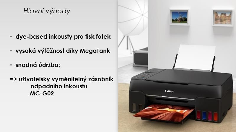 PIXMA G640 je první multifunkční tiskárna řady PIXMA G se šesti doplnitelnými zásobníky inkoustu, která nabízí tisk fotografií v nevídané kvalitě a umožňuje velkoobjemový tisk s extrémně nízkými náklady.