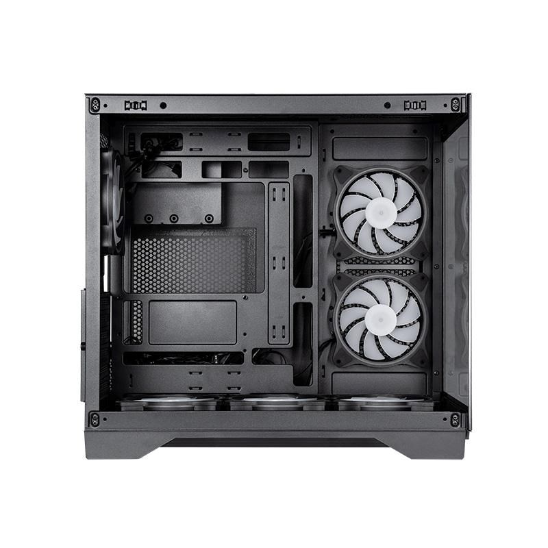 CHIEFTEC Visio má panely z tvrzeného skla na levé i přední straně a dvoukomorové uspořádání pro nejnovější základní desky s připojením zezadu (kompatibilní s ASUS BTF a MSI Project Zero). Tato konstrukce zjednodušuje správu kabelů a zajišťuje čistý výhled do interiéru a nerušené proudění vzduchu.