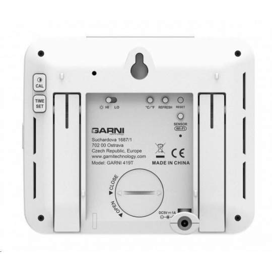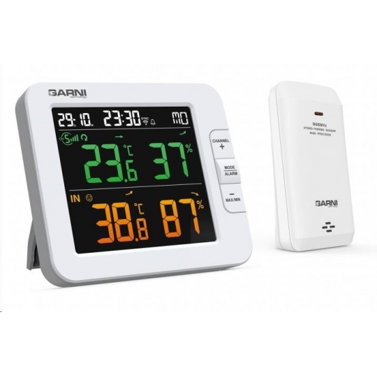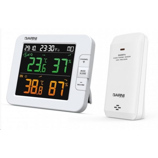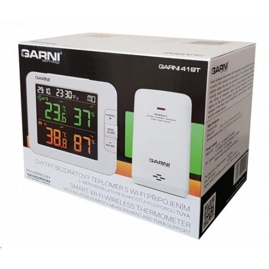 Chytrý vícekanálový teploměr s vlhkoměrem, model GARNI 419T má vestavěný modul WiFi a prostřednictvím svého chytrého systému je kompatibilní s platformou Tuya IOT. Pomocí aplikace Tuya Smart můžete sledovat teplotu a relativní vlhkost hlavní jednotky a bezdrátových čidel, kontrolovat historii záznamů, nastavovat alarmy pro dané veličiny, spouštět pokročilé funkce za pomocí naměřených hodnot a naměřená data odeslat na email v Excel souboru. Je možné jej propojit s dalšími produkty chytré domácnosti, ovládání pak probíhá přes aplikaci v mobilním zařízení. Hlavní jednotka i bezdrátové čidlo jsou osazeny švýcarskými čidly SENSIRION. TUYA spolupracuje s platformou pro chytrou domácnost Tuya připojení k místní Wi-Fi síti 2,4 GHz spolupracuje s aplikací Tuya Smart jazykové mutace aplikace - čeština, slovenština, angličtina barevný inverzní LCD displej o rozměrech 90 x 81 mm stále osvětlený displej, 2 stupně jasu, nastavení kontrastu v 15 úrovních velikost číslic na displeji – čas 9 mm, datum, zkratka názvu dne 7,5 mm, teplota 21,5 mm, relativní vlhkost 21 mm barvy na displeji – čas, datum, zkratka názvu dne bílá, vnitřní teplota a rel. vlhkost oranžová, vnější teplota a rel. vlhkost zelená měření vnitřní a vnější teploty a relativní vlhkosti zobrazení teploty ve °C, nebo °F švýcarská čidla SENSIRION možnost použití až 7 bezdrátových čidel (GARNI 055H, bazénové čidlo GARNI 057P) indikace vnitřní tepelné pohody 3 ikonami možnost kalibrace teploty a rel. vlhkosti vnitřní a na jednotlivých kanálech bezdrátový přenos hodnot vnější teploty a relativní vlhkosti na frekvenci 868 MHz ikona síly signálu z bezdrátových čidel ikona připojení k místní Wi-Fi síti paměť na maximální a minimální naměřené denní a celkové hodnoty teploty a relativní vlhkosti šipka vývoje teploty a rel. vlhkosti čas a datum řízené z Internetu s možností manuálního nastavení budík s možností opakovaného buzení (Snooze) po 5 minutách budící signál - 4 sekundy 1 pípnutí za sekundu, 4 sekundy 2 pípnutí za sekundu, 4 sekundy 3 pípnutí za sekundu a poté stále 4 pípnutí za sekundu ikona slabých baterií možnost aktualizace firmware barva hlavní jednotky bílá napájení síťovým adaptérem a záložní baterií možnost postavení a zavěšení Bezdrátové čidlo GARNI 055H vlhkosti odolné měření teploty a relativní vlhkosti švýcarská čidla SENSIRION 7 kanálů možnost postavení a zavěšení barva bílá možnost postavení a zavěšení napájení bateriemi 2 ks typ AA (tužkové, nejsou součástí dodávky) Obsah balení hlavní jednotka 1 ks bezdrátové čidlo GARNI 055H síítový adaptér návod CZ, SK, EN. DE, PL, HU, NL.