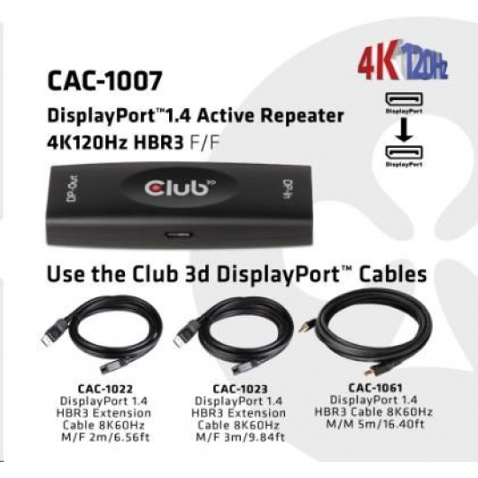 Club3D Adaptér aktivní DisplayPort 1.4 Repeater 4K120HZ HBR3 (F/F), černá