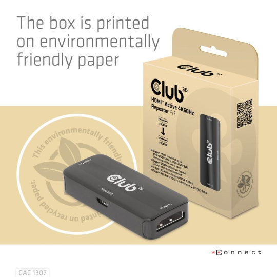 Club 3D CAC-1307 HDMI™ Active 4K60Hz Repeater prodlužuje délku jakéhokoli kabelu HDMI™ regenerací signálu HDMI™ před odesláním výstupů do monitoru nebo projektoru HDMI™. Aktivní opakovač HDMI™ odstraní digitální šum (jiskry) ve vašem obrazu. Vstup aktivního opakovače HDMI™ je připojen pomocí dlouhého kabelu HDMI™ (male to male) ze zařízení HDMI™, jako je DVD přehrávač nebo satelitní set top box s výstupním portem HDMI™. Výstup aktivního opakovače HDMI™ je připojen k druhému kabelu HDMI™ (male to male) pro přechod z výstupu na jakýkoli displej nebo projektor HDMI™ s konektorem HDMI™. Jednotka je umístěna co nejblíže k displeji (max. vzdálenost 5 m/16,4 stopy), aby se odstranil veškerý šum, který byl generován dlouhým kabelem HDMI™.