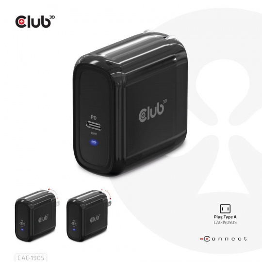 The Club3D CAC-1905 Travel Charger PPS 65W GAN technology, Single port USB Type-C, Power Delivery(PD) 3.0 Support. Compact size & Superior Performance: GAN technology chipset makes this charger 50% smaller than a 65W MacBook chager, small enough to carry anywhere.The Programmable Power Supply(PPS) 65W wall charger match a variety of PD devices from smart phones to laptops, one for all making charging simple. This wide compatibility charger will be your convenient companion during your business trip or vacation.