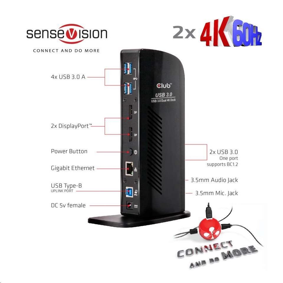 Club3D Dokovací stanice USB-A nebo USB-C, 10v1 2xDP, 6xUSB, 1xRJ45, 1x3.5mm, černá