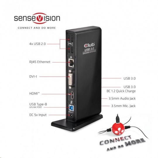 Díky čipu DisplayLink ™ DL-3900 je možné k dokovací stanici připojit dva externí monitory s vysokým rozlišením prostřednictvím výstupů HDMI ™ a DVI-I. Má ethernetový port RJ 45 pro spolehlivé a rychlé drátové připojení k síti a nabízí celkem 6 portů USB pro periferie a paměťové zařízení, stejně jako výstup zvuku a mikrofonu. To vše je připojeno k vašemu zařízení pomocí jediného kabelu USB.