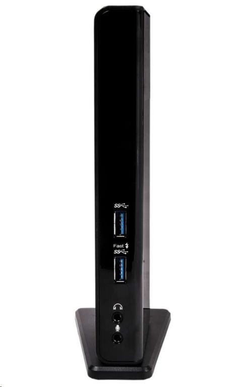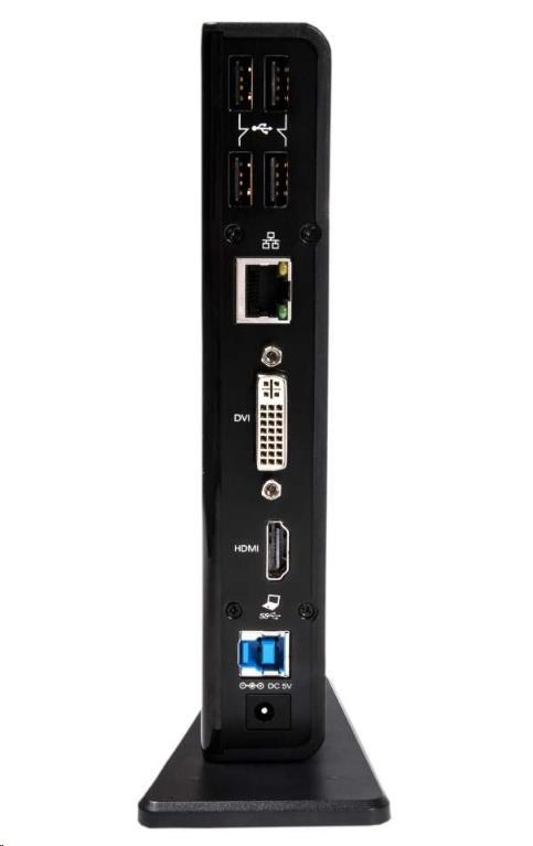 Díky čipu DisplayLink ™ DL-3900 je možné k dokovací stanici připojit dva externí monitory s vysokým rozlišením prostřednictvím výstupů HDMI ™ a DVI-I. Má ethernetový port RJ 45 pro spolehlivé a rychlé drátové připojení k síti a nabízí celkem 6 portů USB pro periferie a paměťové zařízení, stejně jako výstup zvuku a mikrofonu. To vše je připojeno k vašemu zařízení pomocí jediného kabelu USB.