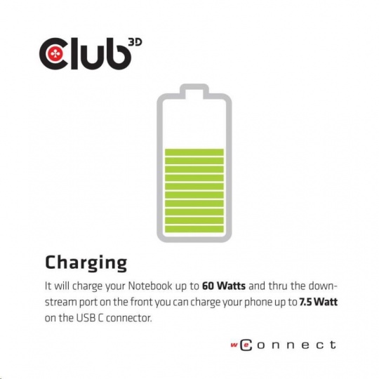 Laptops / UltraBooks / Tablets often have limited connectivity possibilities. By adopting PD Charging technology and upstream-charging function through USB Type C interface the Club3D USB Type C Charging Dock offers unique functionality. It will charge your Notebook up to 60Watts and thru the downstream port on the front you can charge your phone up to 7.5 Watt on the USB C connector.