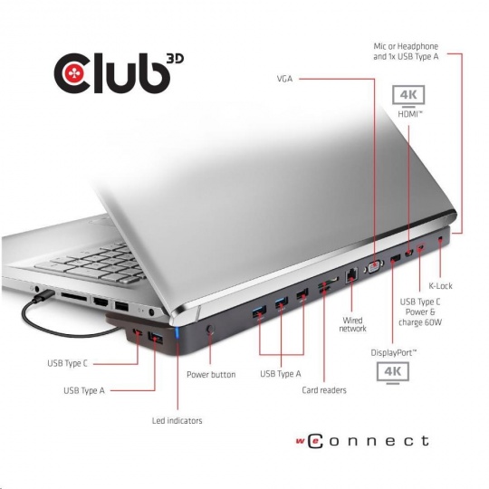 Club3D Dokovací stanice USB-C 14v1, 1xDP, 1xHDMI, 1xVGA, 2xUSB-C, 5xUSB, čtečka SD karet, 1xRJ45, černá