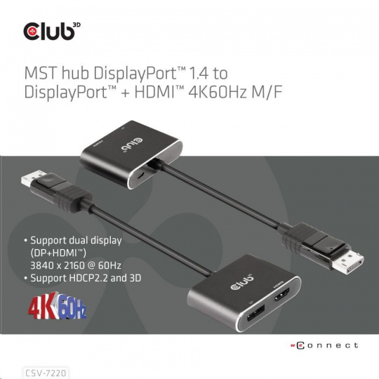 Club3D hub MST (Multi Stream Transport) DisplayPort 1.4 na DisplayPort + HDMI 4K60Hz (M/F)