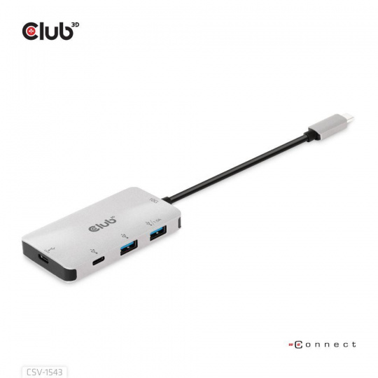The Club 3D CSV-1543 is an USB Gen2 Type-C PD Charging Hub to 2x Type-C 10G ports and 2x USB Type-A 10G ports.The two USB Type-A ports are designed for transmitting data and one of the two USB Type-A ports can provide 1.5A charging for the connected USB Type-A devices (mobile phones, tablets, U-disk, etc). One of the two USB Type-C ports is designed for transmitting data and charging for the connected USB Type-C device, the other USB Type-C port supports both data and PD3.0 charging. It can work on any USB Type-C host (PC, notebook, tablet, Mobile phone, etc) that supports DP Alt mode.