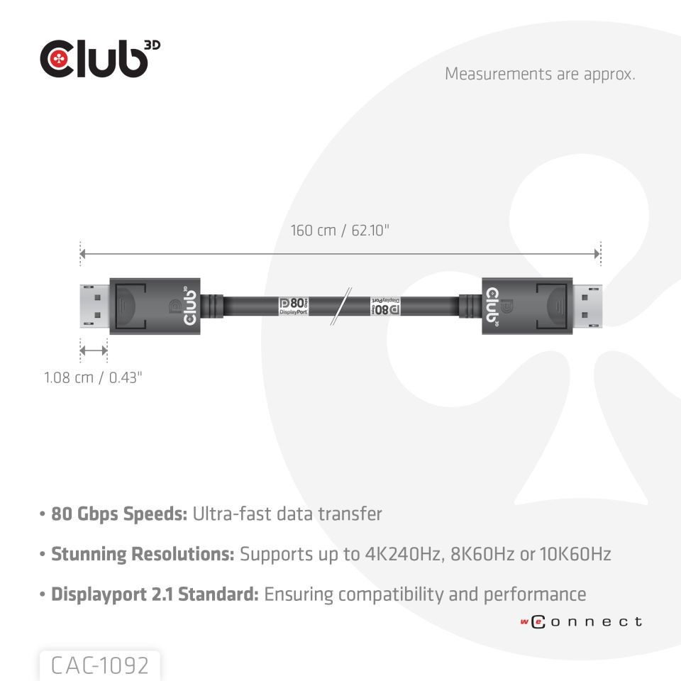 Club3D Kabel DisplayPort 2.1 na DisplayPort 2.1, VESA DP80, 4K240Hz/8K60Hz/10K60Hz (M/M), 1.6m, černá