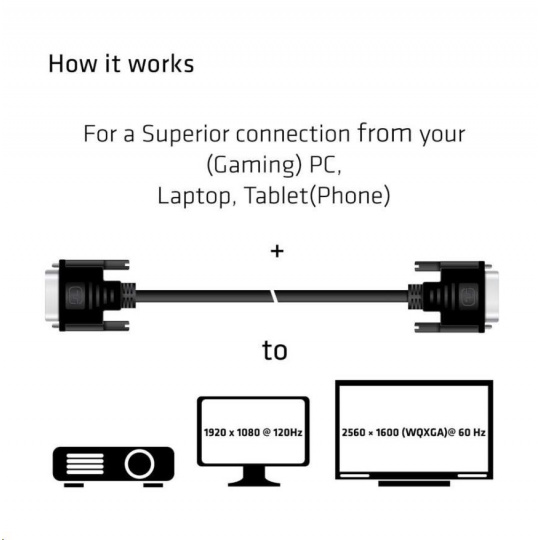 Please use one of our DVI-D (Extension/Adapter) cables to connect to your devices: In case you need assistance to choose the correct cable, please visit our website www.club-3d.com or feel free to mail us at support@club-3d.com and it will be our pleasure to assist you
