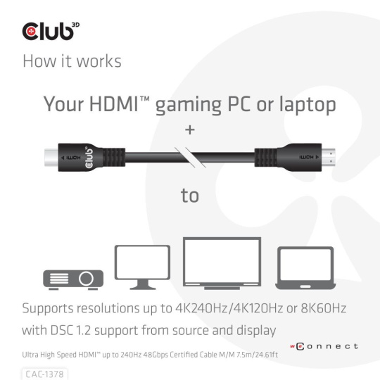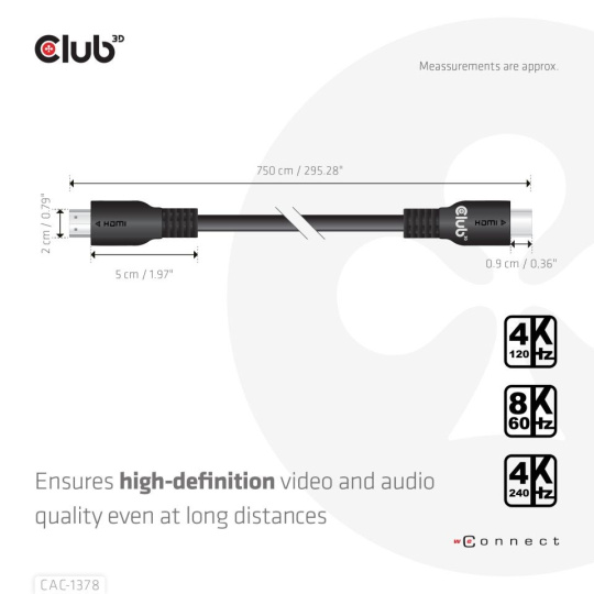 Club3D Kabel HDMI, Ultra Rychlý HDMI™ Certifikovaný Cable, 4K120Hz/ 8K60Hz, 7.5m