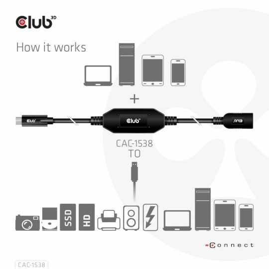 The Club 3D CAC-1538 USB Gen1 Type-C to Type-A Active Adapter Cable 5Gbps M/F 10m / 32.8ft connects your Notebook, Tablet or Phone with USB Type-C output to your favorite existing Peripherals, Accessories and Chargers featuring the common USB Type-A plug. It enables Data and Power over a single cable and both ways. This cable supports USB Gen1. SuperSpeed+ data up to 5Gbps and up to 900mA output for Downstream charging or powering your USB Type-A enabled Notebook, Tablet or Smartphone.