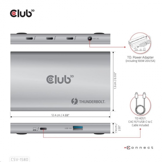 The Club 3D CSV-1580 is a Certified Thunderbolt™ 4 portable Hub which provides the most advanced, efficient, and versatile I/O solution available with up to 40Gb/s for data and video. For the first time this Thunderbolt™ 4 modern Hub has 3 Thunderbolt™ 4 downstream ports that allow you to cascade Thunderbolt™ 4 devices to one 8K30Hz or two 4K60Hz monitors, it can also easily connect to any USB Type-C device, all while simultaneously charging the PC. Besides, it supports Smart Power function which enables to distribute power according to the power consumption of the connected device, making full use of external power supply. It is designed for Thunderbolt™ 4 based PCs and Thunderbolt™ 3 based Macs™ utilizing MacOS™ 11 and later versions.