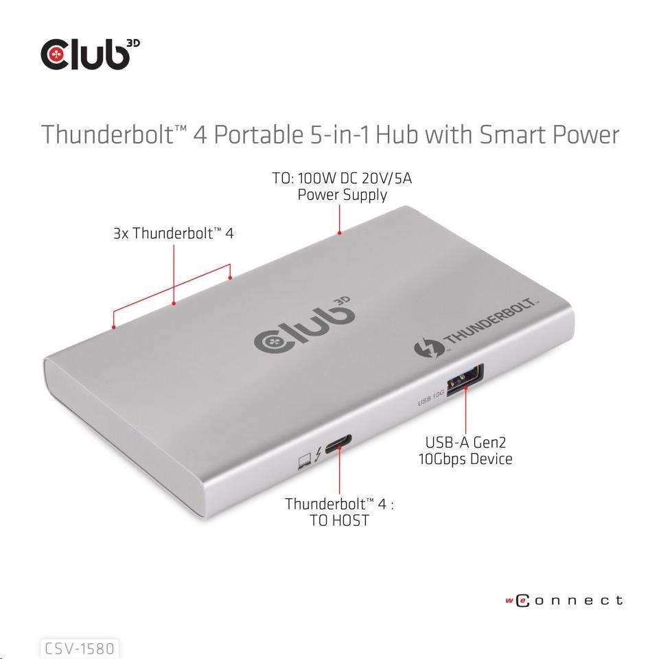 The Club 3D CSV-1580 is a Certified Thunderbolt™ 4 portable Hub which provides the most advanced, efficient, and versatile I/O solution available with up to 40Gb/s for data and video. For the first time this Thunderbolt™ 4 modern Hub has 3 Thunderbolt™ 4 downstream ports that allow you to cascade Thunderbolt™ 4 devices to one 8K30Hz or two 4K60Hz monitors, it can also easily connect to any USB Type-C device, all while simultaneously charging the PC. Besides, it supports Smart Power function which enables to distribute power according to the power consumption of the connected device, making full use of external power supply. It is designed for Thunderbolt™ 4 based PCs and Thunderbolt™ 3 based Macs™ utilizing MacOS™ 11 and later versions.