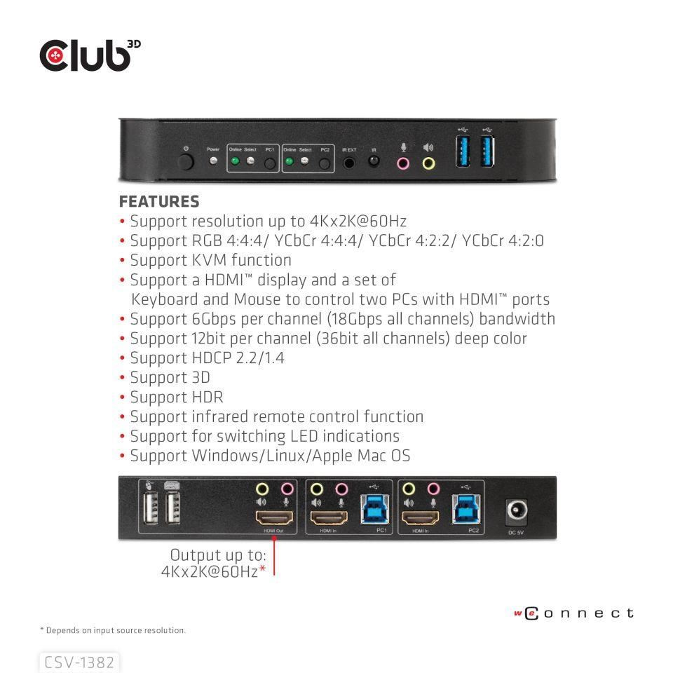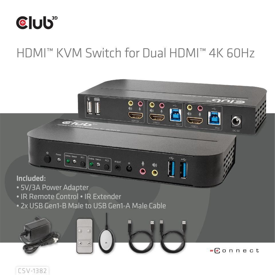 Club3D síťový přepínač - Switch, HDMI KVM Switch - Dual HDMI 4K 60Hz