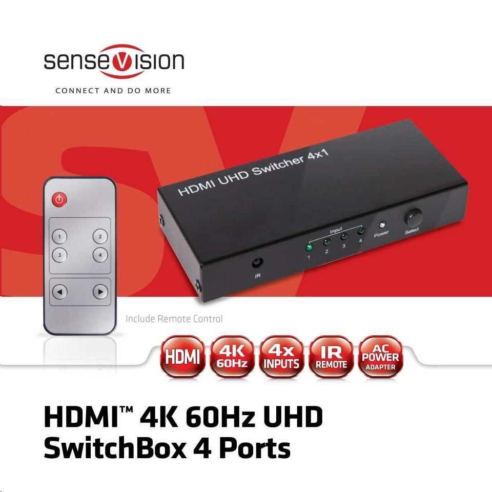 SenseVision HDMI ™ 2.0 UHD 4K60Hz SwitchBox 4 port je vysoce výkonný a malý přepínač HDMI ™ 2.0 UHD 4K60Hz se čtyřmi vstupy a jedním výstupem. Má matný černý kovový plášť, který je velmi silný a robustní. Ideální asistent jak doma, tak i na pracovišti. Tento přepínač HDMI ™ 2.0 UHD 4K60Hz přenáší video ve vysokém rozlišení až ve 4k @ 60Hz a digitální zvuk z jakéhokoli ze 4 vstupů zdroje do připojeného (4K UHD) televizoru, monitoru nebo projektoru.