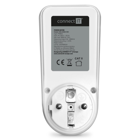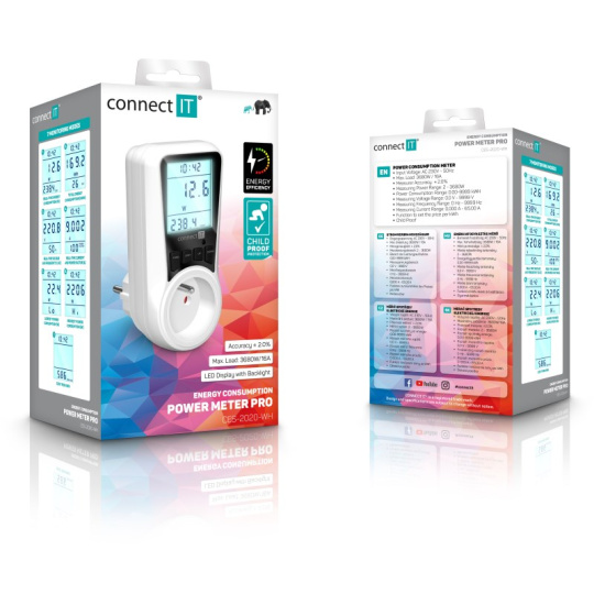 Digitální měřič CONNECT IT "PowerMeter Pro" s jednoduchým designem slouží k měření spotřeby elektrické energie různých domácích spotřebičů. Měřič disponuje velkým podsvíceným LED displejem a jednoduchým ovládáním. Díky tomu je velmi přehledný a spolehlivý.