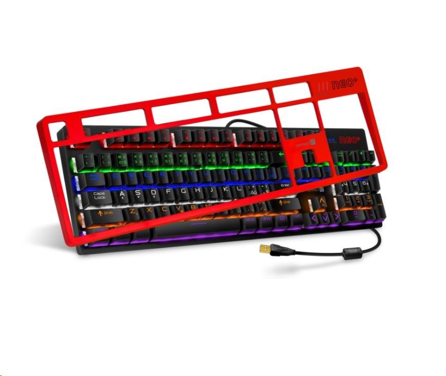Profesionální mechanická klávesnice NEO+ series pro hráče počítačových her v českém a slovenském layoutu s celkem 22 módy barevného rainbow podsvícení a pětistupňovou regulací intenzity podsvícení. K dispozici je 12 multimediálních kláves.