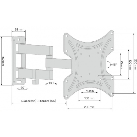 Rozměry držáku při maximální vzdálenosti od stěny (š x v x h): 220 x 220 x 308 mm