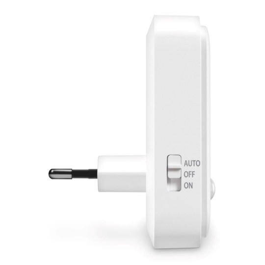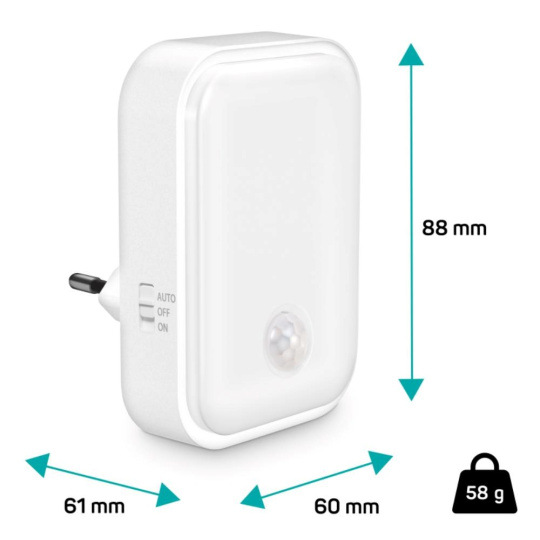 Světlo disponuje posuvníkem, který umožňuje zapnout/vypnout světlo a nastavit režim automatického zapnutí při zaznamenání pohybu v šeru. Světlo stačí jednoduše zapojit do libovolné zásuvky a při příkonu 0,80 W se nemusíte bát spotřeby elektrické energie. LED zdroj světla disponuje světelným tokem 30 lumenů.