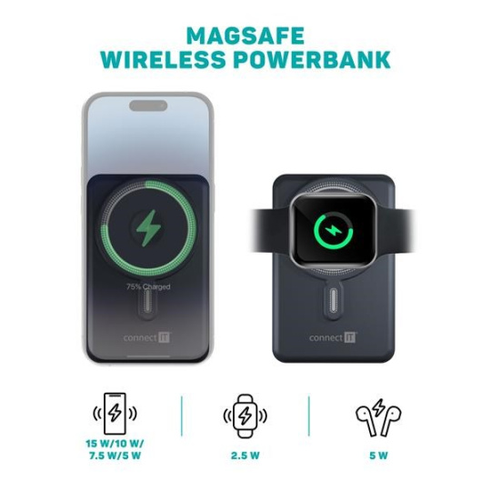 Bezdrátová MagSafe powerbanka s kapacitou 10000 mAh kompatibilní s Apple iPhone a Apple Watch. Disponuje integrovaným USB-C a Lightning kabelem. Podporuje až 20 W rychlonabíjení pomocí USB-C kabelu.