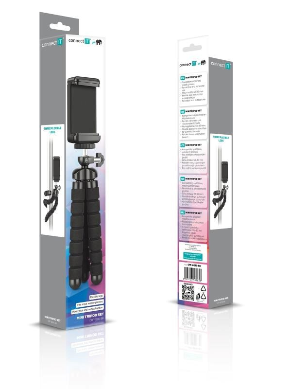 Mini Tripod set s flexibilními nohami, které lze přichytit například na větve stromů, zábradlí, řídítka kola nebo na monitor počítače a mnoho dalších míst a různých úhlů. Gumové zakončení nohou zaručují stabilitu na jakémkoliv povrchu. Mini tripod set je velmi skladný a schová se do každého batohu nebo kabelky, ve složeném stavu měří 24,5 cm a váží pouhých 76 g. Maximální zatížení je 0,5 kg. Součástí Mini Tripod setu je držák, který sedí na šířku většiny telefonů na trhu a je možné ho v něm umístit jak na šířku, tak na výšku, podle potřeby uživatele.