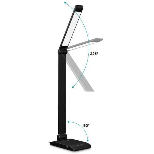 Díky sklopnému rameni a krku nastavíte dokonalý úhel pro jakoukoliv práci. Lampička disponuje USB-A výstupem s výkonem 5 W a dvěma praktickými dotykovými spínači, které umožňují zapnout/vypnout lampu, nastavit 3 úrovně jasu světla nebo nastavit barevnou teplotu světla ve 3 různých úrovních (3000/4000/6500 K).