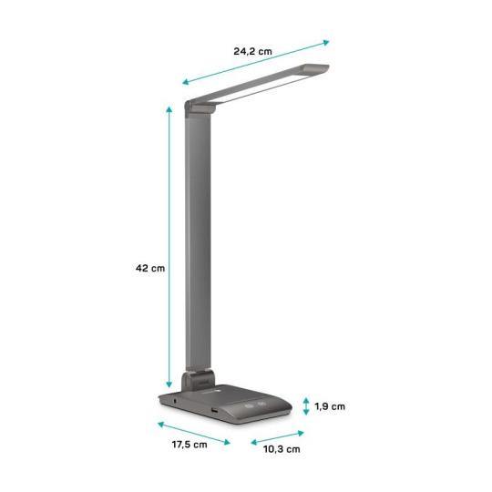 Díky sklopnému rameni a krku nastavíte dokonalý úhel pro jakoukoliv práci. Lampička disponuje USB-A výstupem s výkonem 5 W a dvěma praktickými dotykovými spínači, které umožňují zapnout/vypnout lampu, nastavit 3 úrovně jasu světla nebo nastavit barevnou teplotu světla ve 3 různých úrovních (3000/4000/6500 K).