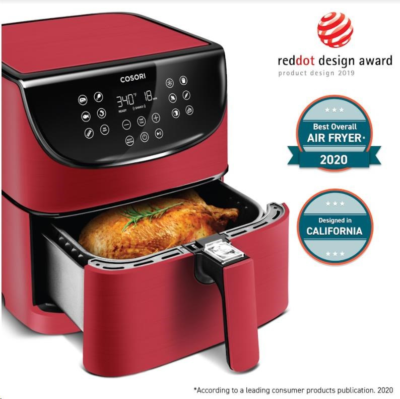 Design horkovzdušné fritézy COSORI CP158-AF byl navržen v Kalifornii. Díky své praktičnosti, funkcím, ovládání i přehlednému dotykovému nakloněnému LED displeji se snadno přístupnými tlačítky získal také prestižní ocenění Red Dot Award a Design Award za nejlepší design. Povrchová úprava je navíc odolná vůči otiskům prstů, takže fritéza bude ve vaší kuchyni vypadat pořád skvěle. Podle prodejních statistik je značka COSORI také nejprodávanější značkou horkovzdušných fritéz v USA.