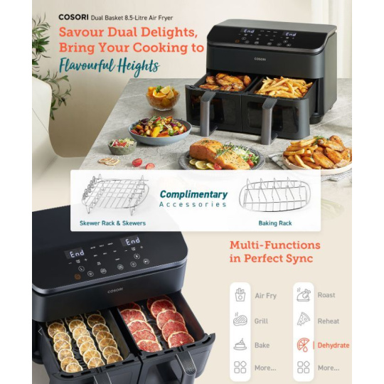 Cosori Dual Basket horkovzdušná fritéza 8.5l + 5x špíz a rošt
