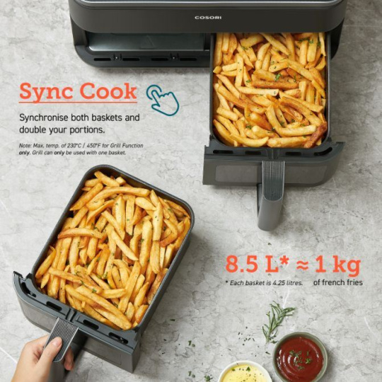 Kapacita každého jednotlivého koše horkovzdušné fritézy Cosori Dual Basket je 4,25 l, její celková kombinovaná kapacita je tedy až 8,5 l. Díky tomuto obrovskému objemu můžete bez obav připravit 2 různé chody pro celou rodinu, nebo dvojnásobné množství jednoho chodu pro vaši rodinu a přátele.