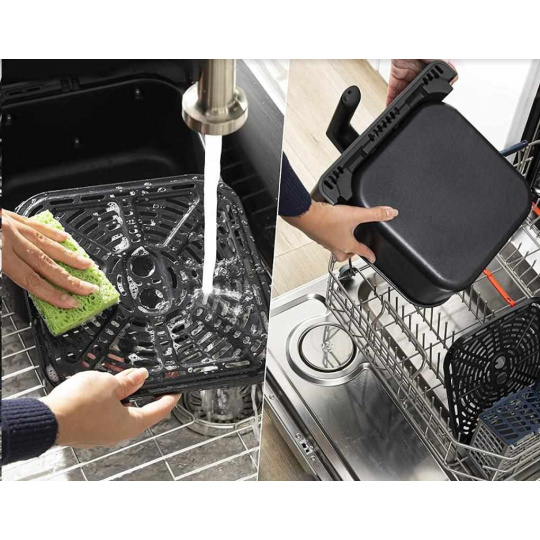 Vyjímatelný fritovací koš a nádoba jsou vyrobeny z odolného, nepřilnavého a zdravotně nezávadného materiálu (BPA a BFOA FREE) a lze je mýt v myčce. Vždy chladná rukojeť a tlačítko pro uvolnění koše eliminují riziko popálení a nechtěného uvolnění.