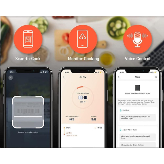 Díky SMART ovládání můžete jídla připravovat pomocí svého smartphonu. Jednoduše si stáhněte bezplatnou aplikaci z Google Play nebo App Store. V aplikaci můžete navolit jednotlivé programy, procházet recepty, sledovat pokrok přípravy jídla nebo nastavit upozornění. Fritéza je také kompatibilní s Amazon Alexa a Google Asistant.
