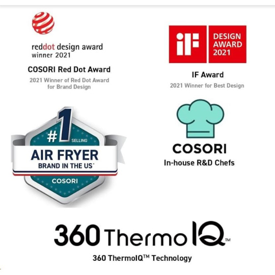 Design horkovzdušné fritézy COSORI CAF-P583S byl navržen v Kalifornii. Díky své praktičnosti, funkcím, ovládání i přehlednému nakloněnému dotykovému LED displeji se snadno přístupnými tlačítky získal také prestižní ocenění Red Dot Award za nejlepší design.